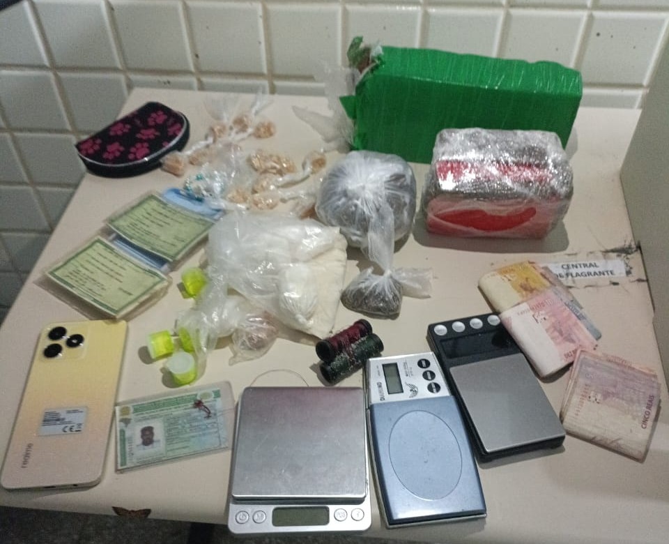 Um tablete e meio de maconha e várias trouxinhas da mesma droga, 17 porções com pedras de crack, oito potes com cocaína, um celular, R$ 300, três balanças e embalagens para acondicionar entorpecentes foram apreendidos na casa de um homem, em Cajazeiras, na terça-feira (27).