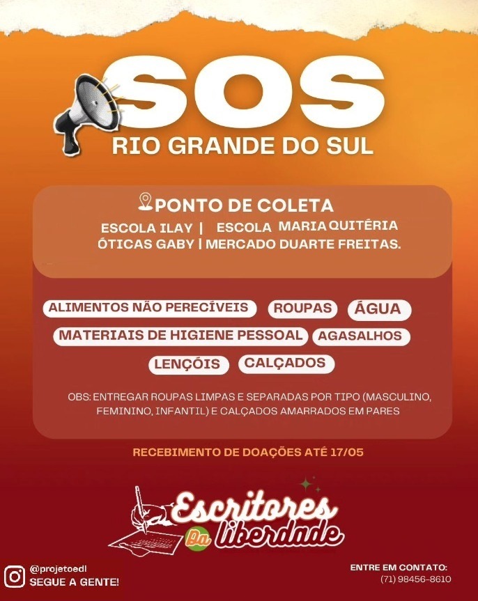 Em mais uma corrente do bem, desta vez formado por estudantes do município, o projeto social Escritores da Liberdade (EDL) realiza a Campanha S.OS. Rio Grande do Sul de arrecadação de doações destinadas às vítimas da tragédia ocorrida no estado, em virtude das fortes chuvas e alagamentos. A iniciativa conta com apoio da Prefeitura de Camaçari, por meio das secretarias da Cultura (Secult) e da Educação (Seduc).