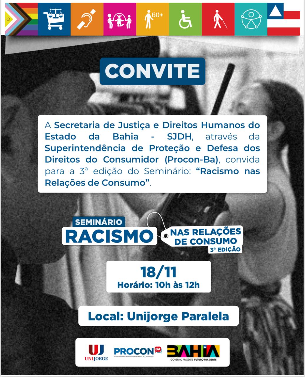 Como parte das celebrações pelo Dia Nacional de Zumbi e da Consciência Negra (20 de novembro), o Procon-Ba (Superintendência de Proteção e Defesa do Consumidor) realiza nesta segunda-feira (18), às 10h, a palestra ‘Racismo nas Relações de Consumo’. A atividade do órgão da Secretaria de Justiça e Direitos Humanos (SJDH) acontecerá no Centro Universitário Jorge Amado (Campus Paralela).