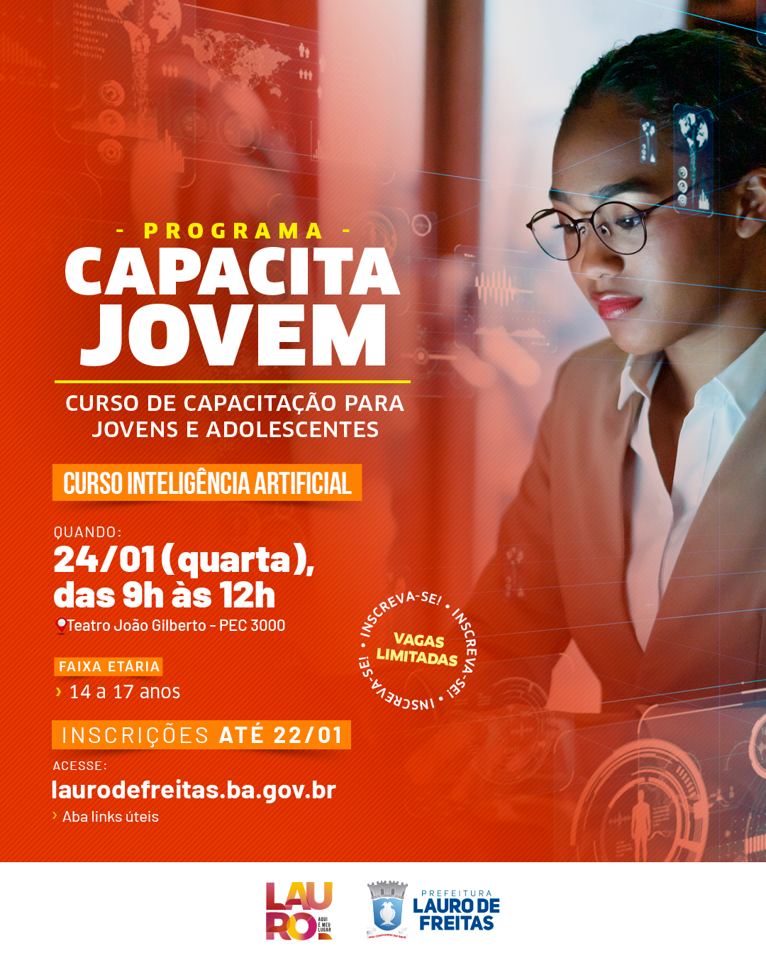 As inscrições estão abertas até o dia 22 de janeiro e podem ser realizadas através do link (https://www.encurtador.dev/redirecionamento/inscricoesCJ11). Outra opção é acessar o site oficial da Prefeitura de Lauro de Freitas, na aba “Links Úteis”.Com 50 vagas, o curso, que busca despertar o interesse dos jovens por áreas relacionadas à tecnologia, será ministrado no Teatro João Gilberto da Estação Cidadania (PEC 3000). A data marcada para a capacitação é o dia 24 de janeiro, das 9h às 12h. Ao final do curso, todos os participantes receberão certificados.