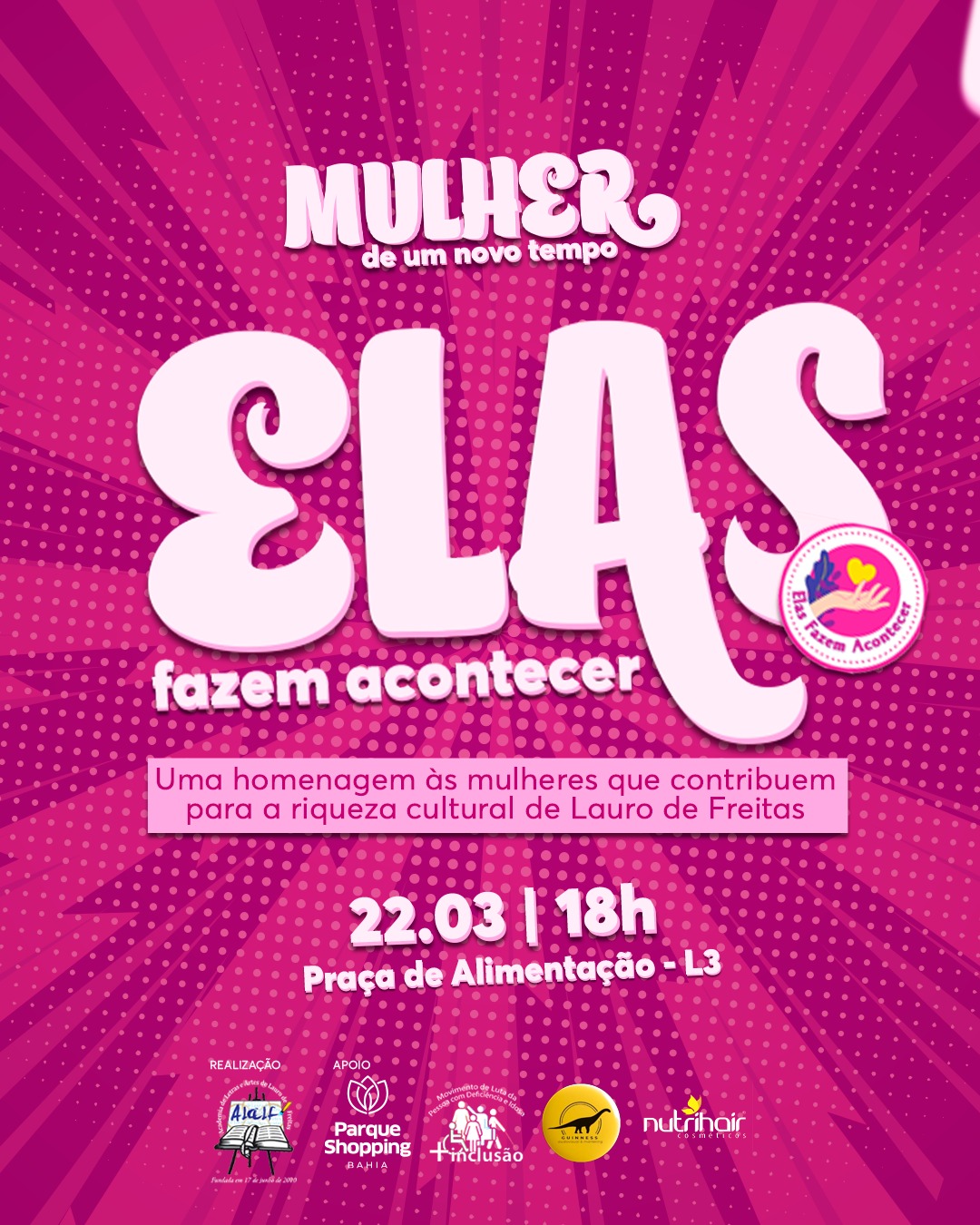 No mês da mulher, o Parque Shopping Bahia será palco de um tributo às figuras femininas que contribuem para o desenvolvimento e a preservação da identidade de Lauro de Freitas. O projeto “Elas Fazem Acontecer” vai homenagear as mulheres que se destacam por sua atuação em áreas como educação, política, religião, comércio e ações sociais do município, neste sábado (22), a partir das 18h. O evento é aberto ao público.