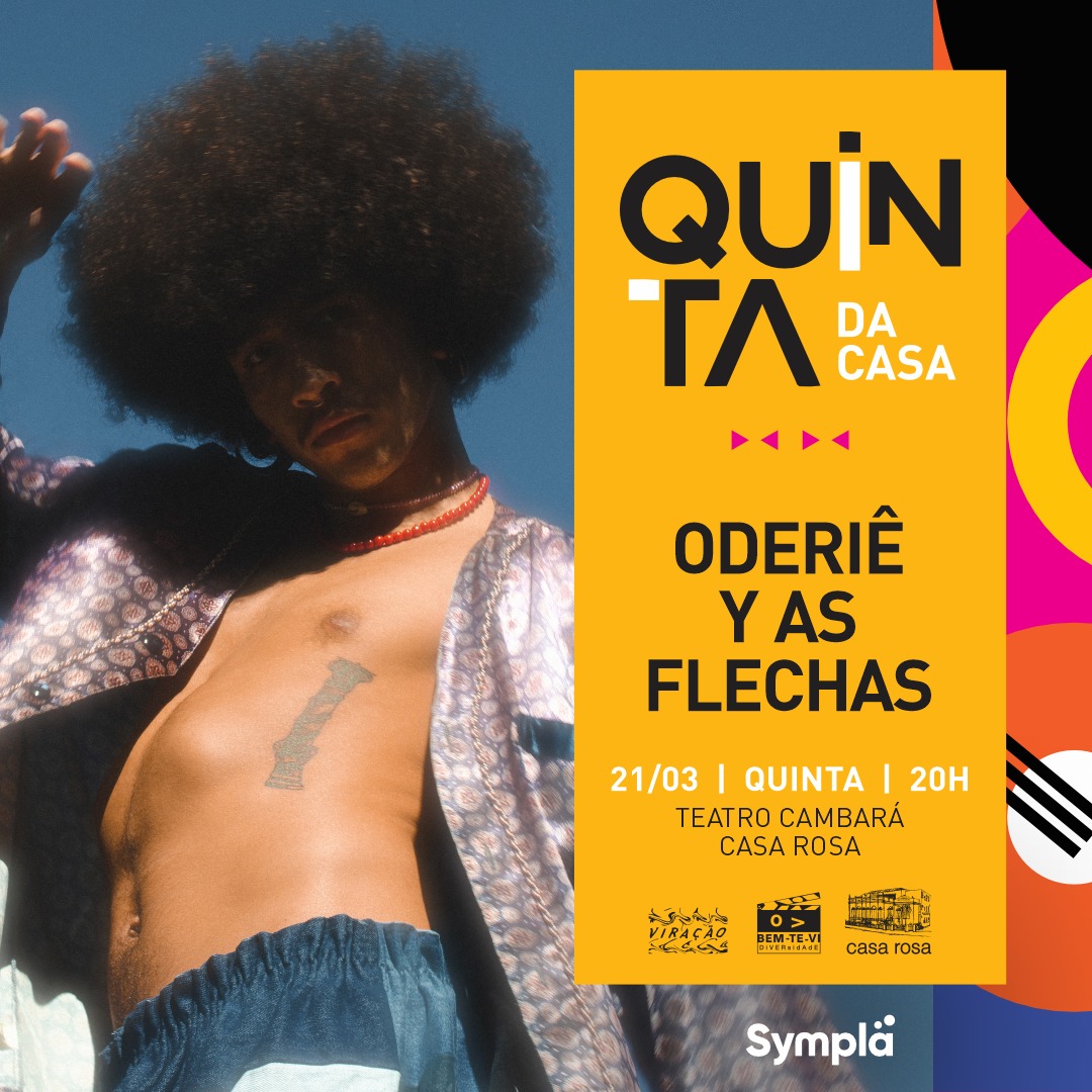 Multiartista afro-indígena da etnia Cha-Yúa (Nação Charruá), Oderiê utiliza a música e o audiovisual para ativar sua cultura e ancestralidade no presente e nas zonas urbanas, nadando contra a colonização de corpos-territórios. Seu projeto “Oderiê y As Flechas”, uma performance sonora, rítmica e poétnica, será apresentado no “Quinta da Casa” da Casa Rosa, no dia 21 de março, às 20h, no Teatro Cambará. Ingressos custam R$ 50 (inteira) e R$ 25 (meia) e estão à venda pela plataforma Sympla.