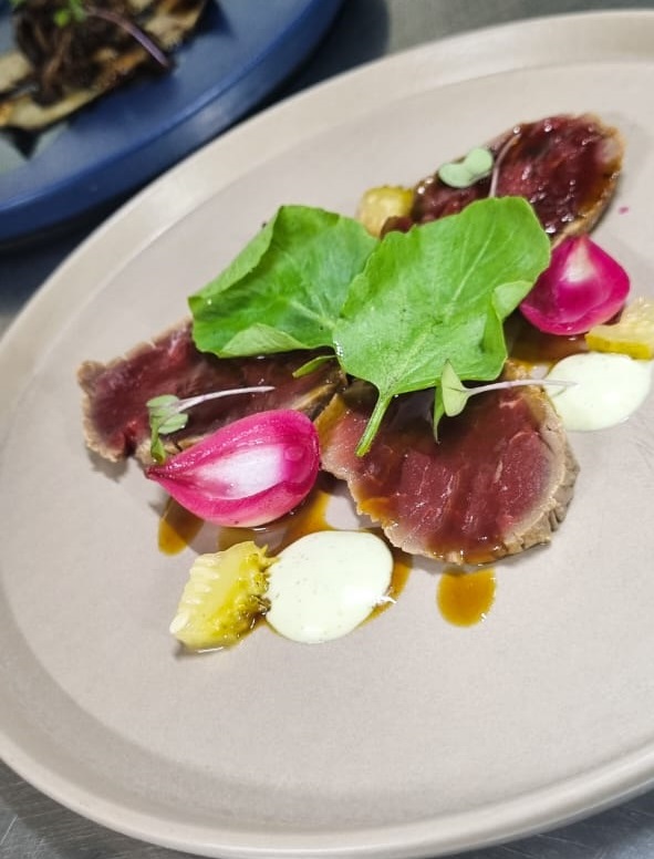 Opção 1: Tagliata de carne do sol + aioli + picles de cebola roxa e maxixe + melaço de pimenta.