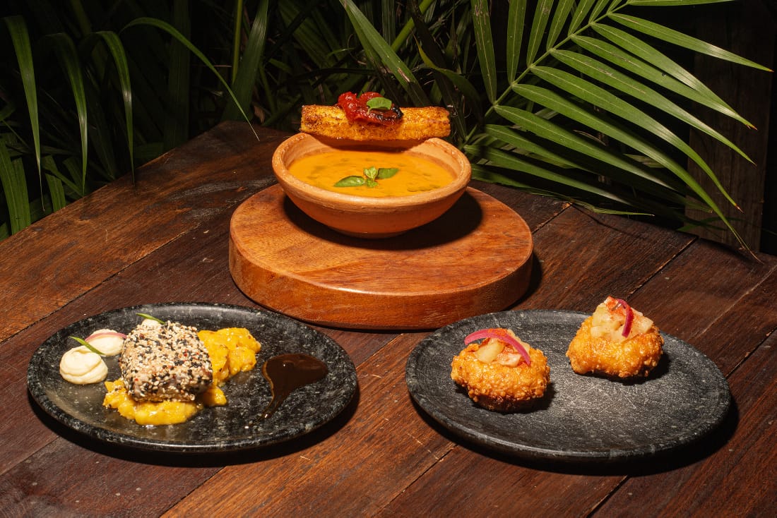 De Entradas, o chef preparou Atum em Crosta de Gergelim, Molho Teriyaki, Agridoce de Manga e Purê de Batata Doce fria; ou os Bolinhos de Queijo Minas com Agridoce de Maçã, Abacaxi e Gengibre; ou o Gazpacho de Tomate e Pimentão, Frita de Polenta e Parmesão.