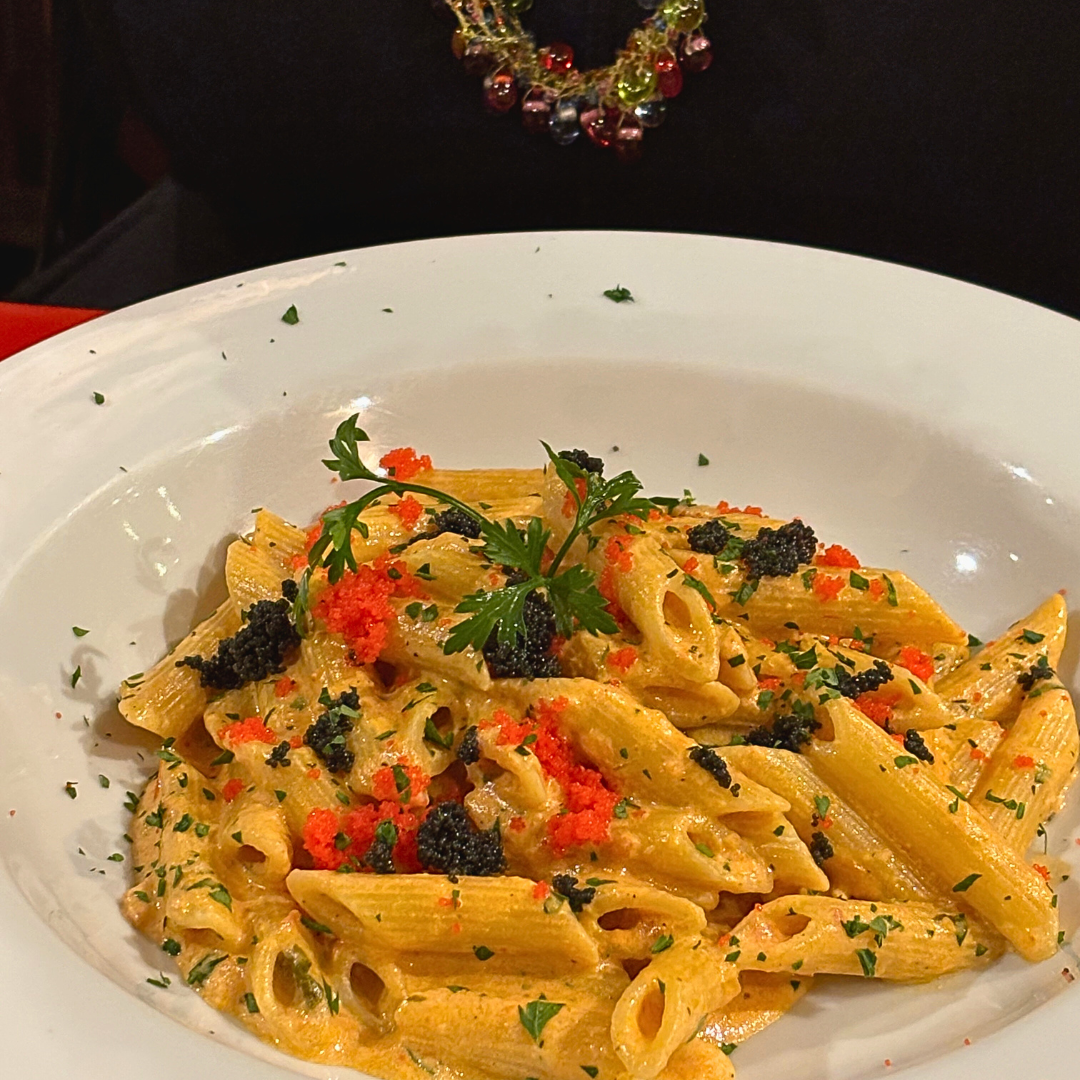 – Pennette de salmão defumado e caviar