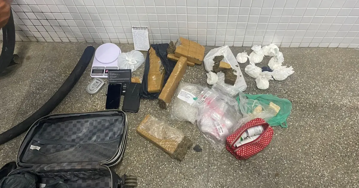 Os policiais realizavam uma ação preventiva na região, quando abordaram um indivíduo, durante as buscas, foram encontradas no interior da mala que portava 710g de pasta base de cocaína, 110g de crack, 5 tabletes de maconha, 3 balanças de precisão e caderno de anotações.