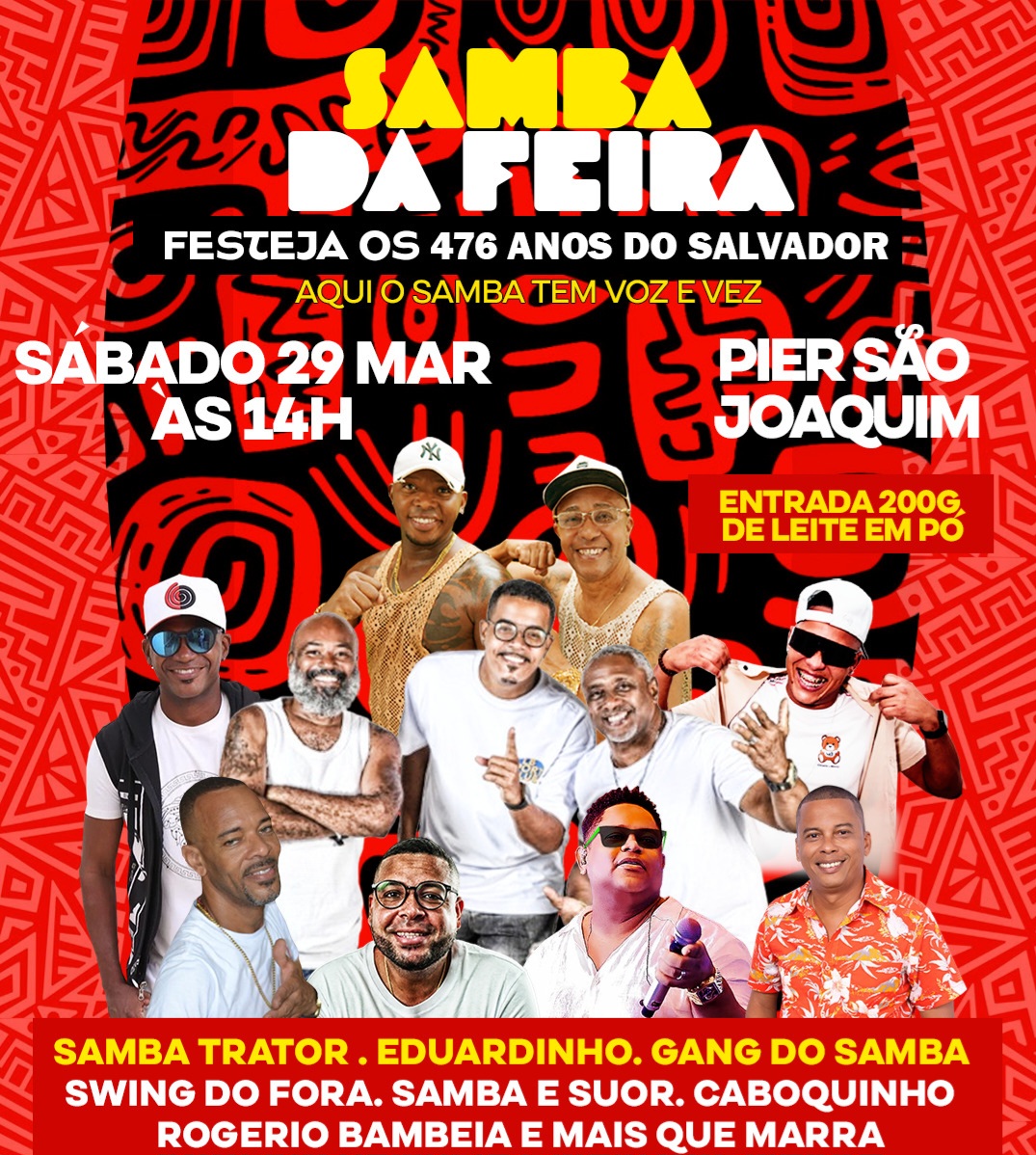 No próximo sábado, 29 de março, a partir das 14h, o Pier São Joaquim será palco de uma grande celebração em homenagem aos 476 anos de Salvador. O evento Samba da Feira promete reunir alegria, tradição e muito samba no pé com o tema “Aqui o samba tem voz e vez”.