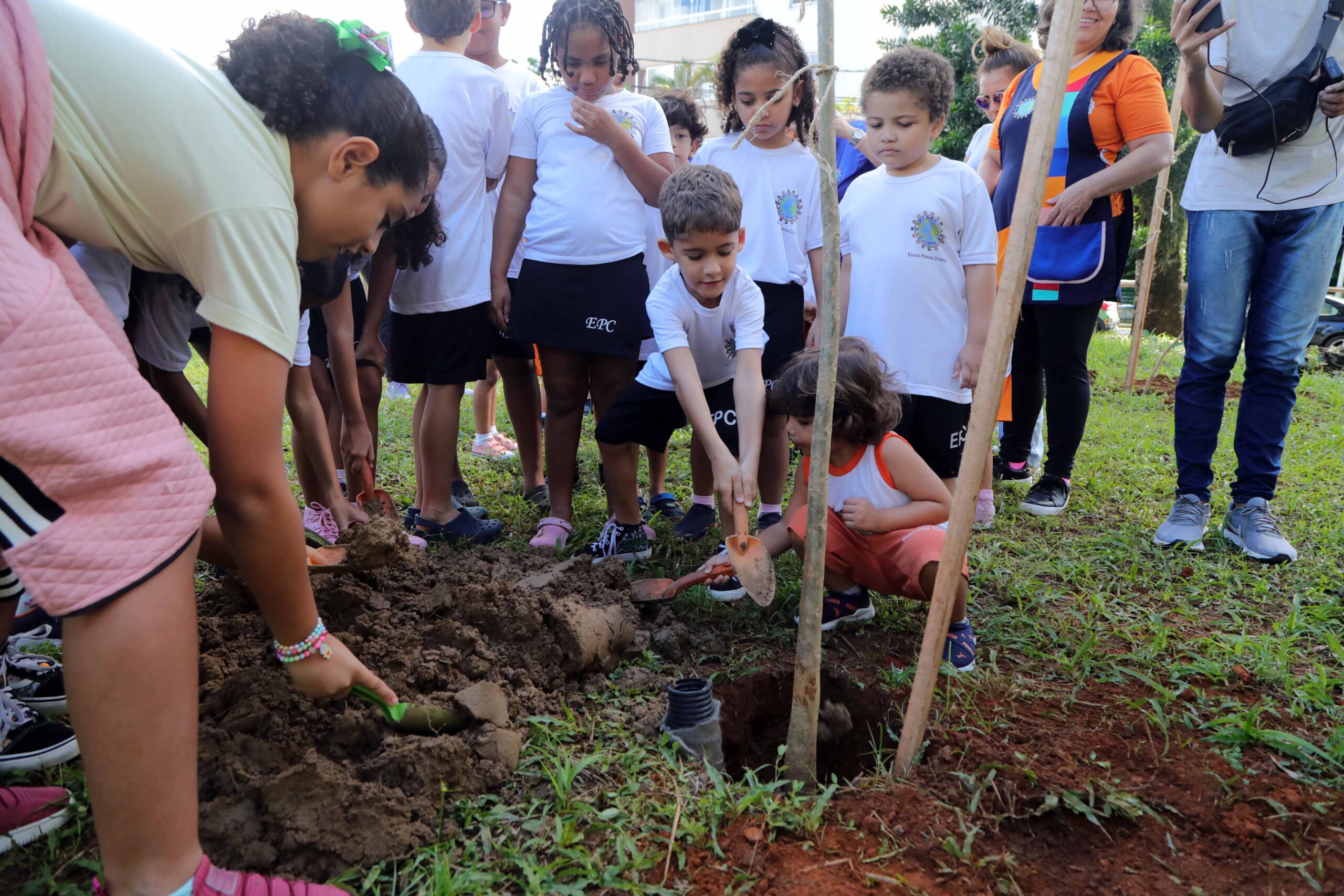 Gabriel Rocha, de 8 anos, afirma já ter familiaridade com o plantio, mas que a ação com árvores é um novo aprendizado. “Já temos atividades com plantas. Acho muito importante termos este contato com elas, ver a árvore crescer junto com a gente”, diz.