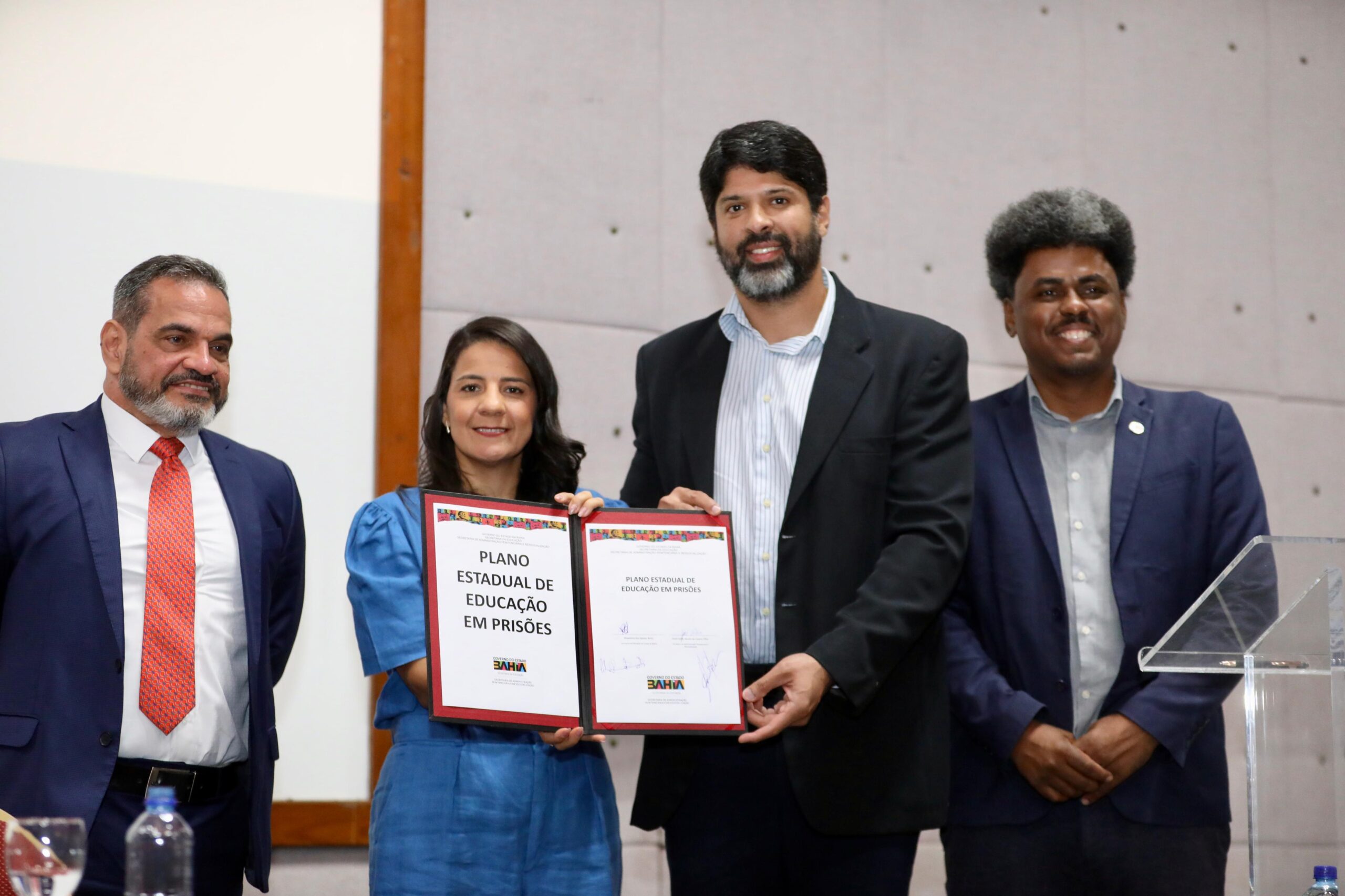Com o tema “A educação em prisões na perspectiva do direito: garantias, desafios e controle social”, o seminário foi aberto com uma apresentação musical do projeto percussivo Oficina de Música nos Presídios, protagonizada por pessoas privadas de liberdade que participam de ações de ressocialização por meio da arte e da educação. A abertura também foi marcada por um momento simbólico, que foi a assinatura oficial do Plano Estadual de Educação em Prisões, firmada pela secretária da Educação, Rowenna Brito, e pelo secretário da Administração Penitenciária e Ressocialização, José Antônio Castro.