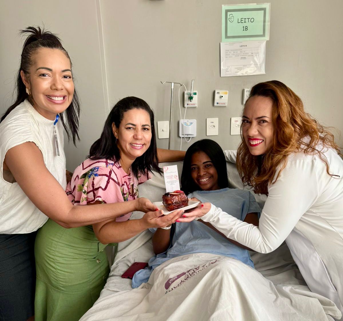 “Hoje é 5 de dezembro, meu aniversário, e eu não poderia ter um presente mais especial do que a minha cirurgia. Durante toda a adolescência, sofri com problemas causados pelo excesso de mamas. Fui encaminhada à Maternidade de Camaçari pelo Hospital da Mulher, e aqui encontrei um atendimento acolhedor e com profissionais competentes”, conta emocionada, ao comemorar com um bolo de aniversário especial feito pela equipe da unidade.