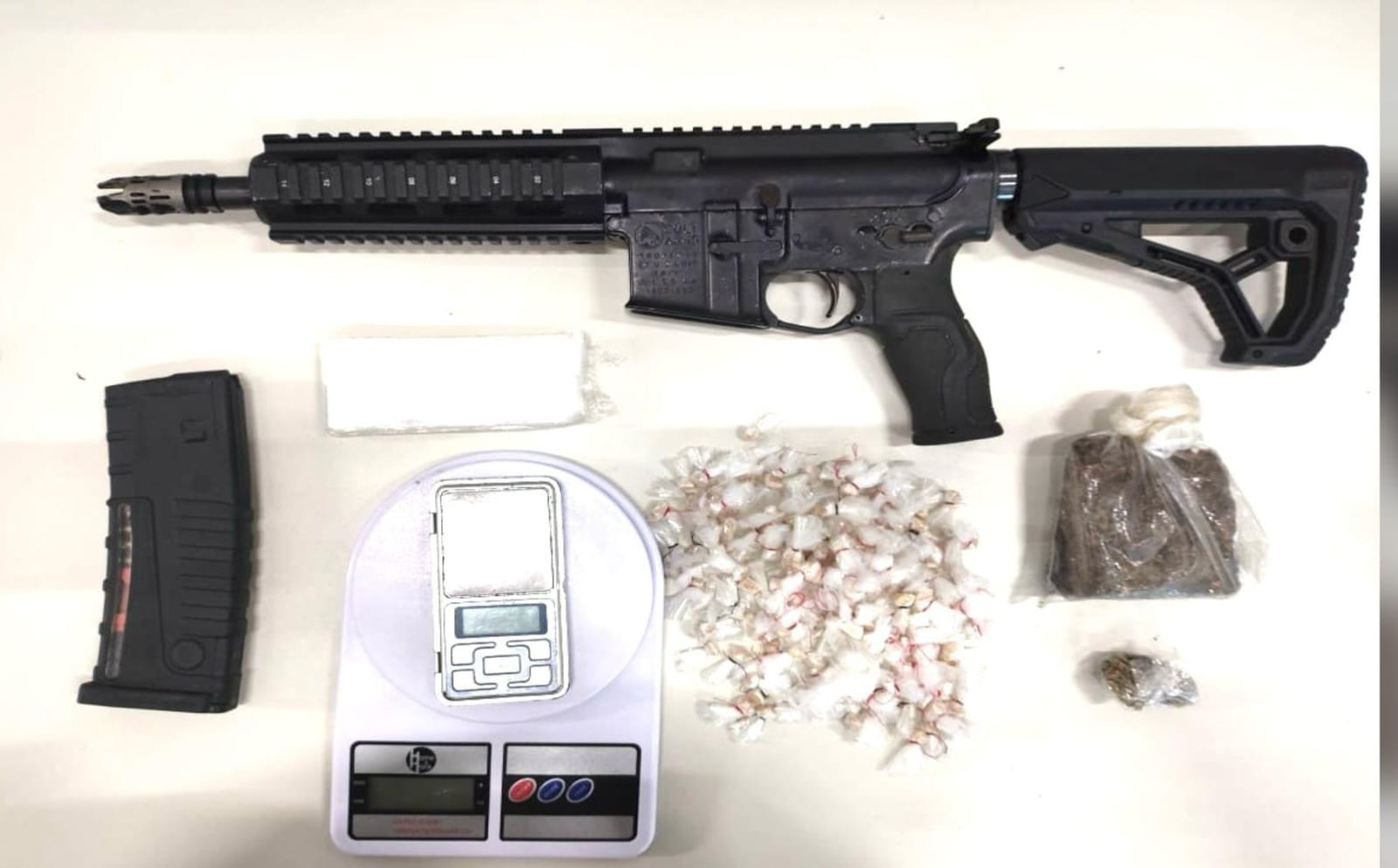 Na região do Alto do Cabrito, os criminosos correram das guarnições da Rondesp BTS e abandonaram um fuzil calibre 5,56, carregador, munições e porções de drogas.