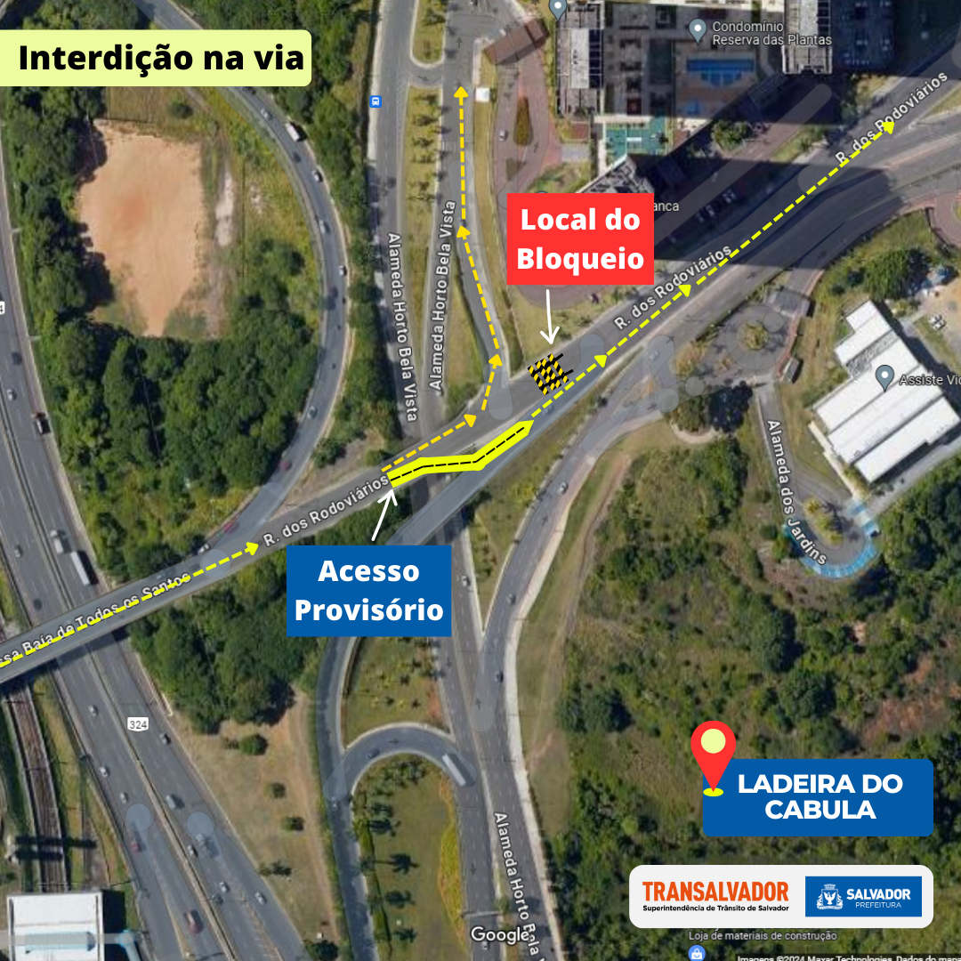 Os condutores que estiverem subindo a Rua dos Rodoviários, popularmente conhecida como Ladeira do Cabula, devem redobrar a atenção a partir do sábado (8). O trânsito será bloqueado na via principal logo após o acesso à BR-324. Sendo assim, neste ponto, o fluxo de veículos será desviado para uma via à direita, onde foi implantada uma interseção provisória e os condutores podem chegar na via principal mais à frente, seguindo para o Cabula/Pernambués.