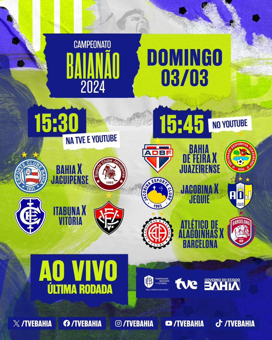 A cobertura começa às 15h30 (pré-jogo), com a transmissão simultânea de Bahia e Jacuipense, direto da Fonte Nova e, Itabuna e Vitória, no estádio Mário Pessoa, em Ilhéus. Os jogos dos líderes do campeonato (Bahia e Vitória) estarão disponíveis na TV e no Youtube.com/tvebahia que ainda exibe as partidas entre Jacobina e Jequié, Bahia de Feira e Juazeirense e Atlético e Barcelona.