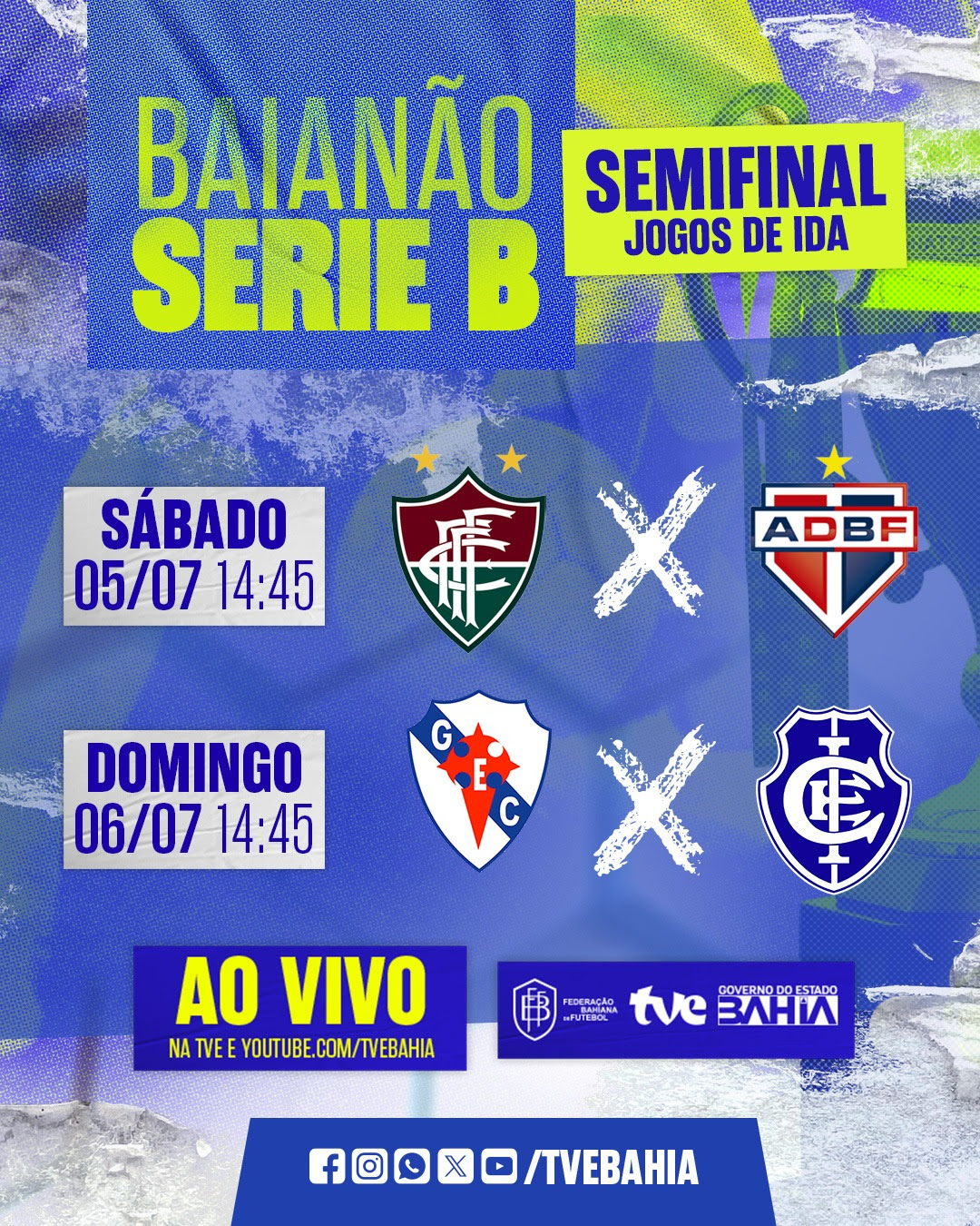 A TVE transmite, neste fim de semana, os jogos de ida das semifinais do Campeonato Baiano da Série B. O Fluminense enfrenta o Bahia de Feira neste sábado (05), no Joia da Princesa, às 14h45 (pré-jogo). Já no domingo (6), no mesmo horário, é a vez do Galícia encarar o Itabuna, na Arena Cajueiro. Os confrontos serão transmitidos pela TV aberta e também poderão ser acompanhados ao vivo pelo youtube.com/tvebahia.