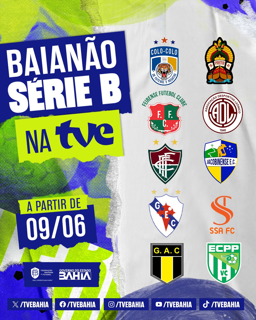 Vai começar a disputa pelo Campeonato Baiano Série B. A partir deste final de semana a TVE inicia a transmissão ao vivo e exclusiva da competição, que reúne 10 times na disputa pelo título: Colo-Colo, Feirense, Fluminense de Feira, Galícia, Grapiúna, Jacobinense, Leônico, Vitória da Conquista e os estreantes SSA FC e Porto.