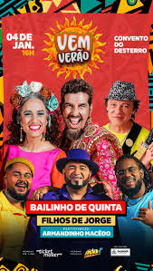 No dia 4 de janeiro, às 16h, o Convento do Desterro, em Salvador,será palco de uma celebração inesquecível para dar boas-vindas ao verão! O evento “Vem Verão” promete reunir música, dança e alegria em um ambiente histórico e encantador. As atrações principais incluem o icônico grupo Bailinho de Quinta, a energia contagiante dos Filhos de Jorge e a participação especial do virtuoso Armandinho Macêdo. O 2º lote está à venda na plataforma de vendas Ticket Maker. https://vendas.ticketmaker. com.br/?ct=3927&cl=528