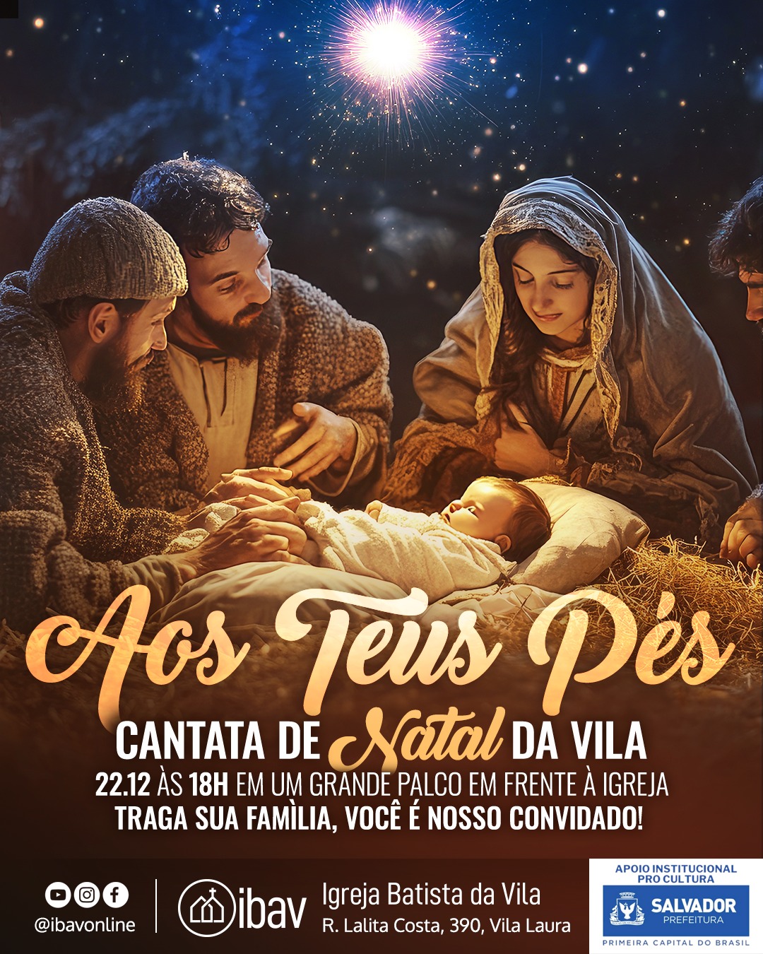 “Aos Teus Pés” é o nome do musical do “Natal na Vila” confirmado para o dia 22 de dezembro, a partir das 18 horas, na Vila Laura (Rua Lalita Costa, 390), em Salvador. O encontro tem como objetivos incentivar a reflexão sobre o verdadeiro sentido do Natal, celebrar o nascimento de Jesus Cristo, louvá-lo e aproximar a comunidade da Vila Laura, Matatu, Luís Anselmo e região da Igreja Batista da Vila (IBAV), que promove o evento com o apoio da Prefeitura de Salvador. A cantata é aberta ao público e acontecerá na rua, que será interditada para realização do evento.