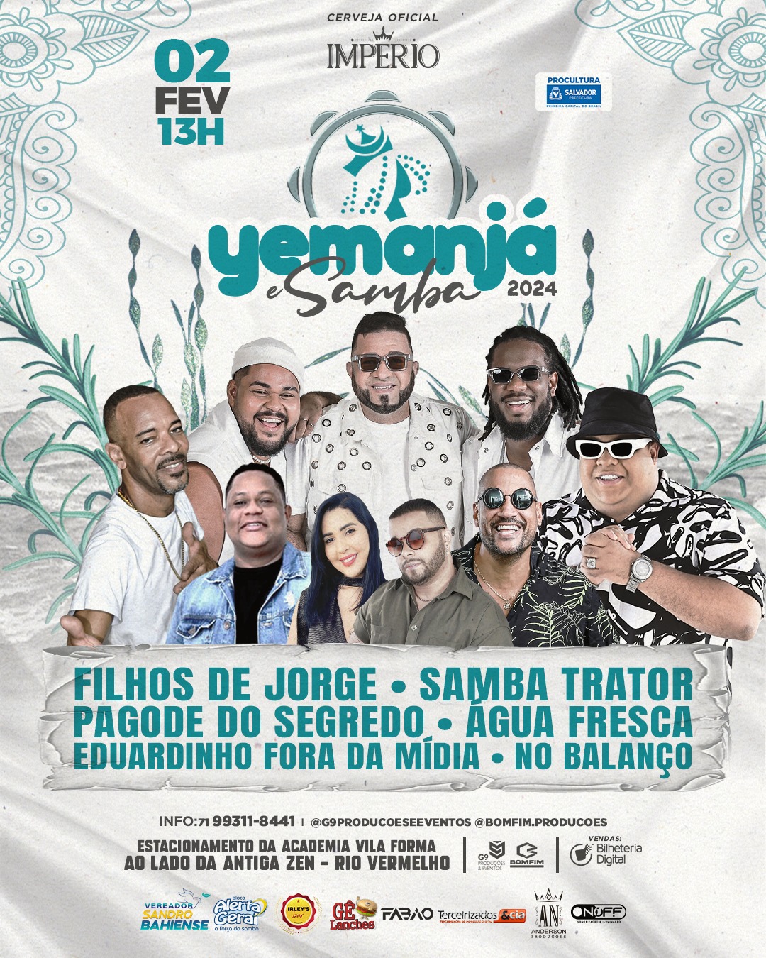 Para além da celebração do dia 2 de fevereiro em homenagem à Iemanjá, uma grande festa vai marcar o bairro do Rio Vermelho, a casa oficial da rainha do mar. Isso porque, vai acontecer também a 11ª edição do evento “Yemanjá e Samba 2024”, a partir das 13 horas, no estacionamento da academia Vila Forma, no bairro boêmio de Salvador, vai tremer com as atrações Filhos de Jorge, No Balanço, Samba Trator, Pagode do Segredo, Água Fresca e Eduardinho Fora da Mídia. A festa que promete ter mais de oito horas de duração, bebida gelada e animação, já está vendendo o 1º lote na plataforma Bilheteria Digital: a pista custa R$ 40 e a área vip R$60. O evento que é produzido pela G9 Produções e Eventos e Bonfim Produções conta com o apoio do Bloco Alerta Geral.
