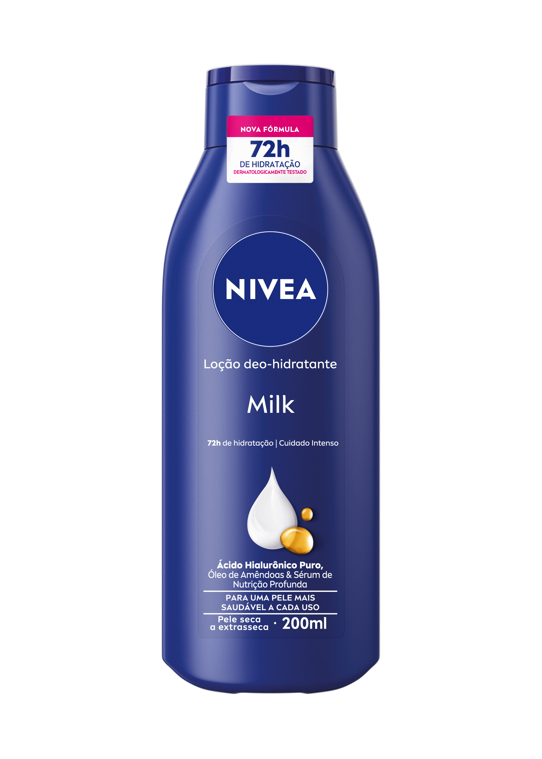 Um dos ícones da marca, NIVEA Milk agora passa a contar com Hialurônico Puro, um dos ingredientes mais queridos do mundo da beleza, oferecendo 72h de nutrição profunda para uma pele mais saudável e macia a cada uso. Apesar da evolução, o produto não deixa de lado atributos da sua essência como o Óleo de Amêndoas, que segue em sua composição, sua fragrância clássica e a textura não oleosa de rápida absorção. A embalagem também ganha um novo visual e passa a ter 50% menos plástico*.
