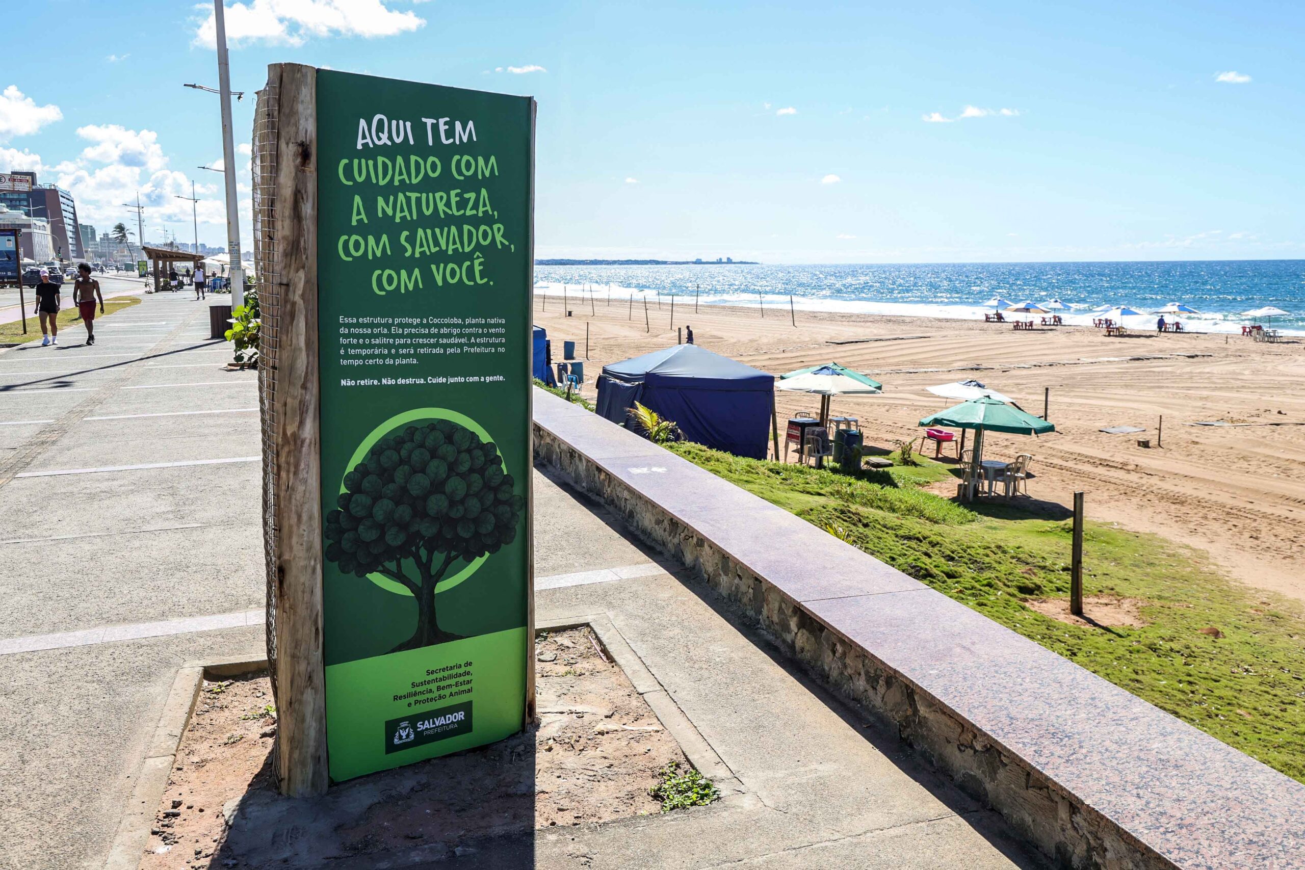 Vinte protetores de mudas foram instalados, nesta quinta-feira (21), entre a orla do Jardim de Alah e o Centro de Convenções de Salvador, na Boca do Rio, pela Secretaria Municipal de Sustentabilidade, Resiliência, Bem-Estar e Proteção Animal (Secis). As armações de madeira, com cerca de 1,80 metro de altura, visam garantir o crescimento seguro das árvores coccolobas, também conhecidas como uvas do mar, até que atinjam a maturidade.
