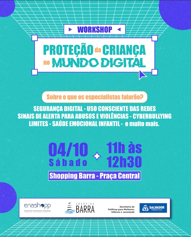 A Prefeitura de Salvador, por meio da Secretaria de Políticas para Mulheres, Infância e Juventude (SPMJ), realiza neste sábado (4), das 11h às 12h30, o Workshop Proteção da Criança no Mundo Digital, na Praça Central (L1) do Shopping Barra.