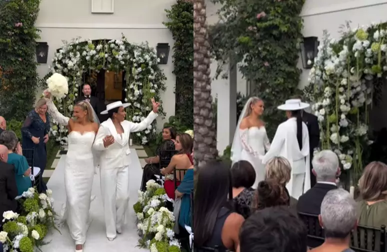 Para a cerimônia, Marta optou por um visual composto por blazer, calça e chapéu, enquanto Carrie Lawrence escolheu um vestido branco rendado. As duas apostaram em trajes totalmente brancos para marcar a ocasião.