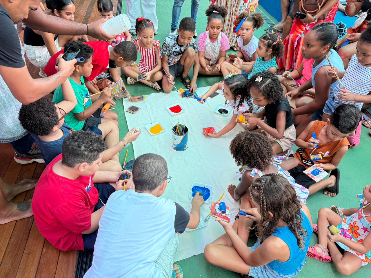 As atividades começaram às 10h com a oficina Estamparia Adinkra, conduzida pelo arte-educador Romário Oliveira, que apresentou às crianças o sistema simbólico originário do povo Akan, em Gana. Em seguida, às 11h30, os artistas Mário Omar e Rick Carvalho encantaram o público com a contação de histórias “O Novo Rei”, inspirada na tradição oral nigeriana.
