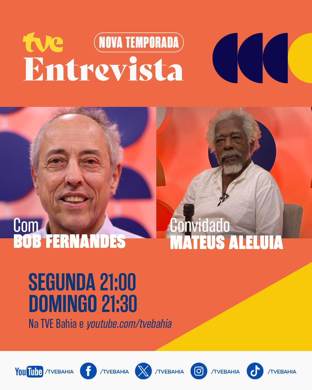 O TVE Entrevista desta segunda-feira (24), às 21h, na TVE, recebe o cantor, compositor e pesquisador Mateus Aleluia. Com apresentação do jornalista Bob Fernandes, o programa traz personalidades de diferentes áreas que se destacam na vida cultural, política, social e científica do país.